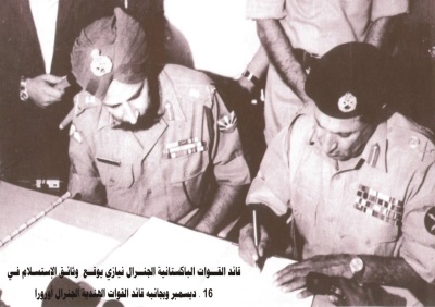 قبلت الباكستان على مضض وقف العمليات الحربية ، وعلى أثر ذلك وقع قائد القوات الباكستانية الجنرال نيازي في 16 من شهر ديسمبر وثائق الاستسلام في داكا وتسلمها منه قائد القوات الهندية الجنرال أورورا.
