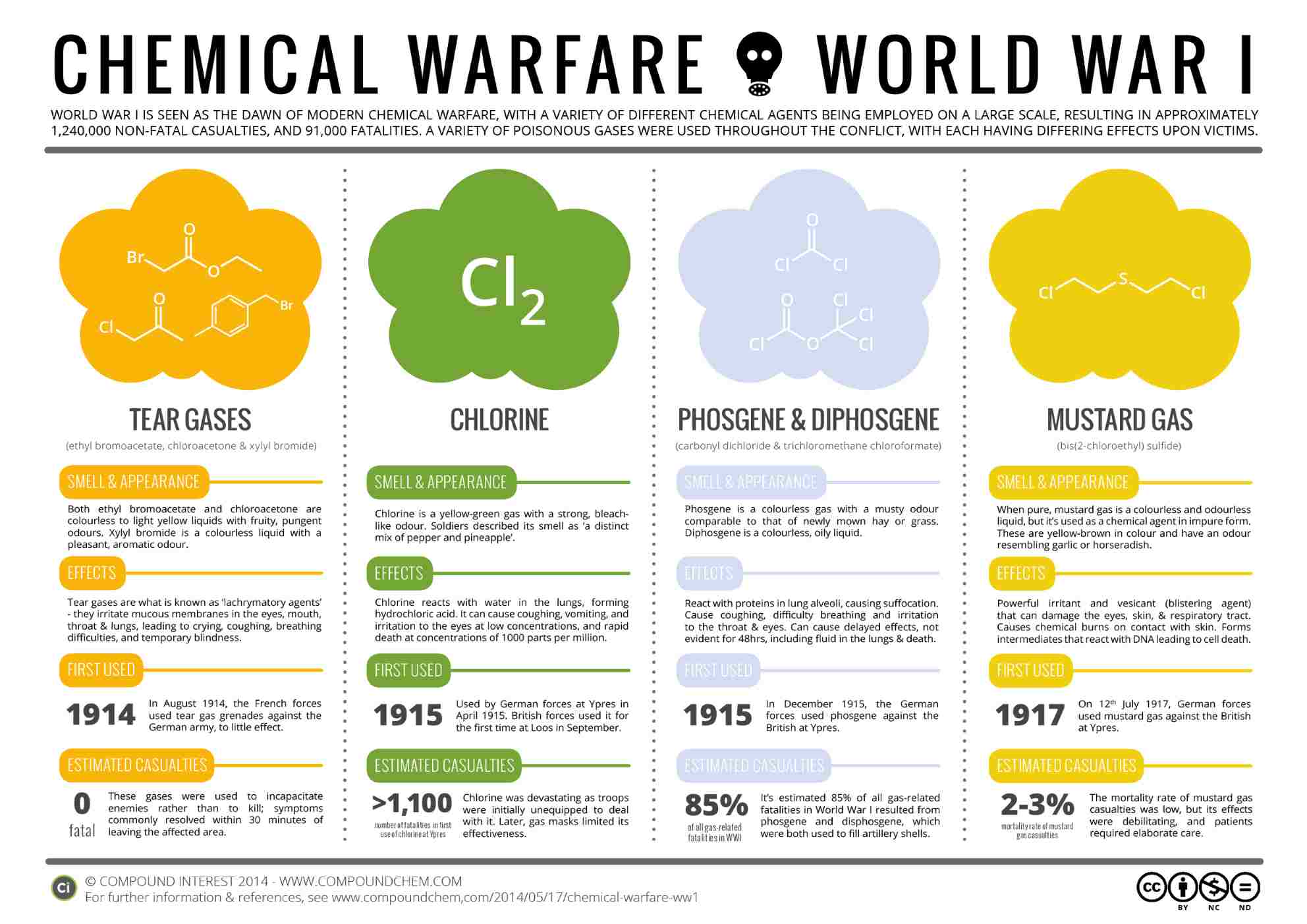 عندما وضعت الحرب العالمية الأولى أوزارها كانت حصيلة من تأثروا بنواتج الأسلحة الكيماوية، وخاصة غاز الخردل، مليونا وثلاثمائة ألف، لقى منهم حتفه ما يزيد عن واحد تسعين ألف. ولو لا الوقاية التي قدّمها القناع وغيره من وسائل الحماية لكان عدد الخسائر أكثر من ذلك بكثير.